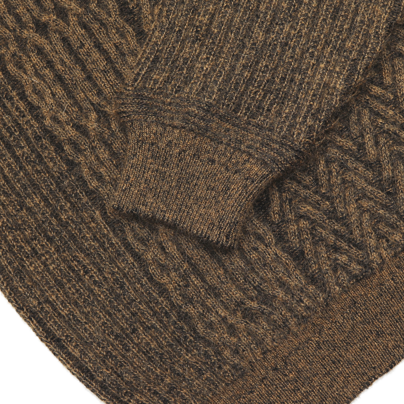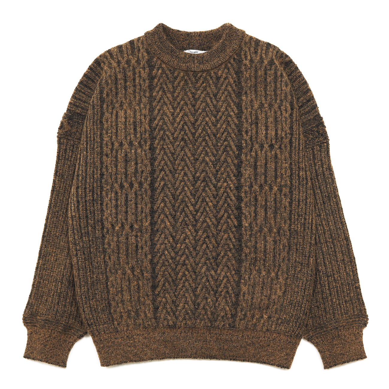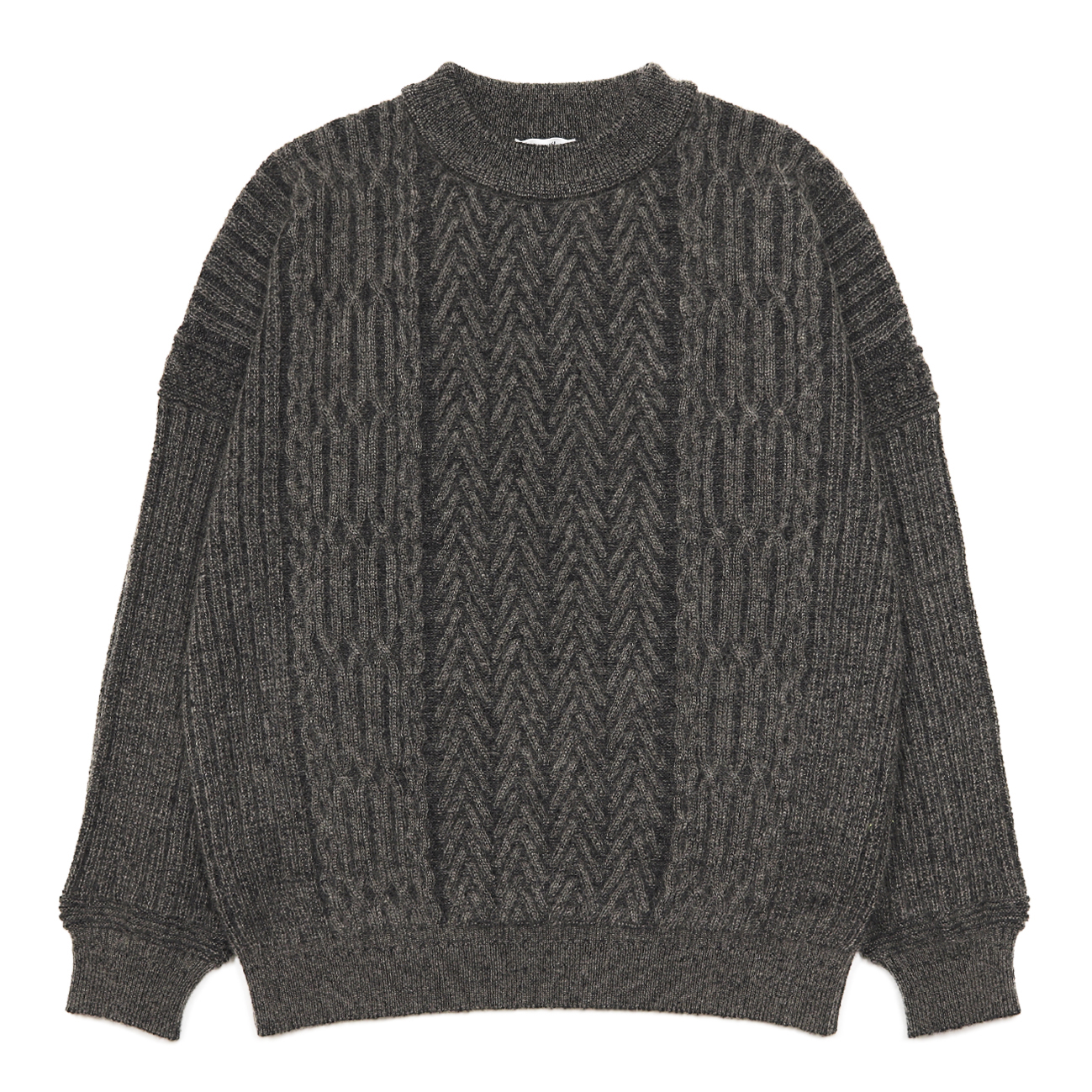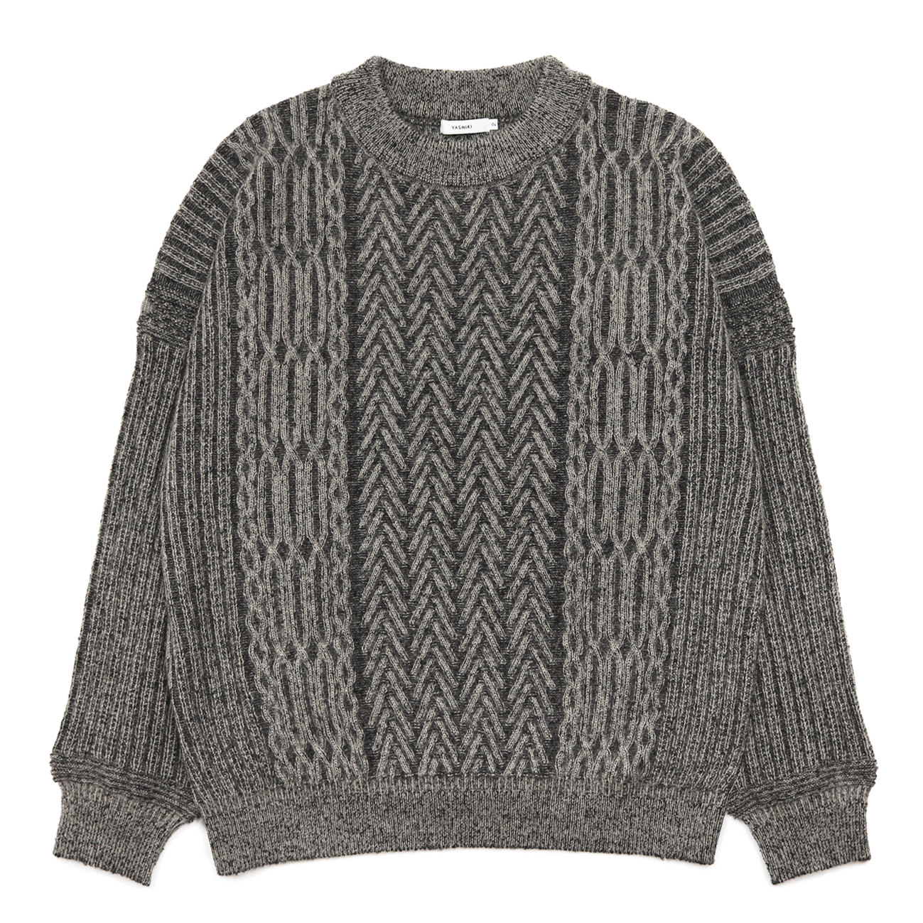 身頃中央の柄で雪が積もった木々を表し、身頃横のケーブル柄で轍を表し、身頃脇と袖の柄で雪に覆われた畝や畦道を表しています。