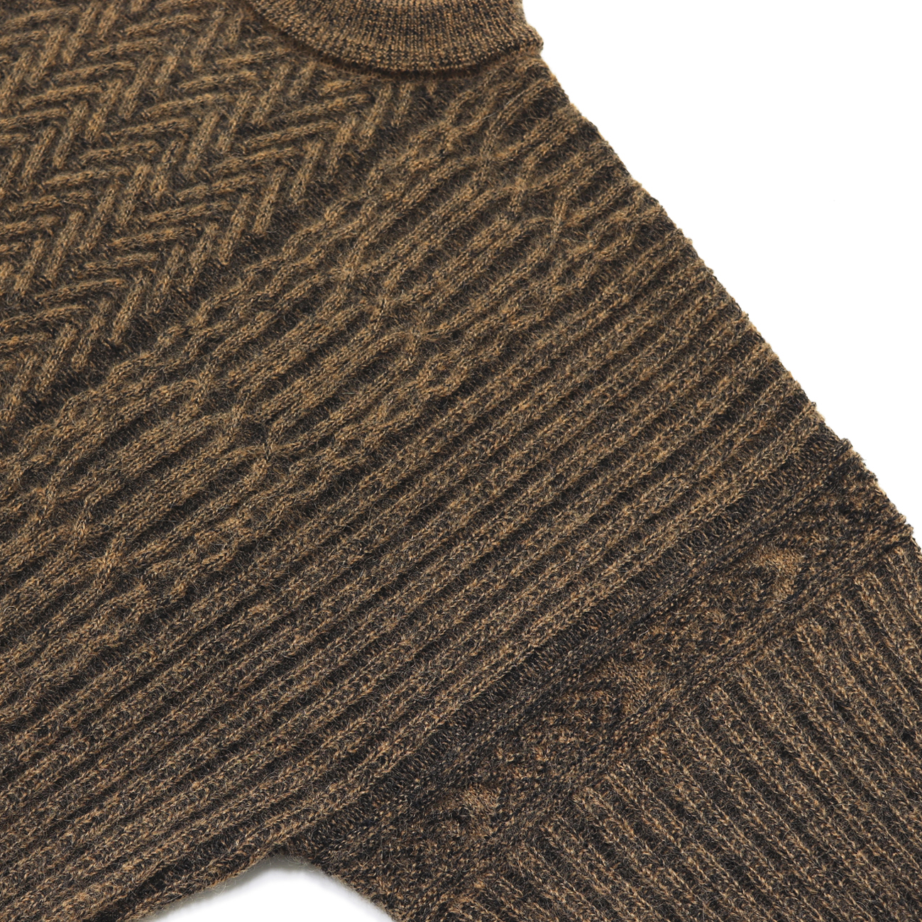 プレーティング編みと言われる表目側と裏目側で異なる糸を編む技法を使用し、表と裏で糸の色を変えて、2色で編むことで奥行きのある表情に仕上げました。