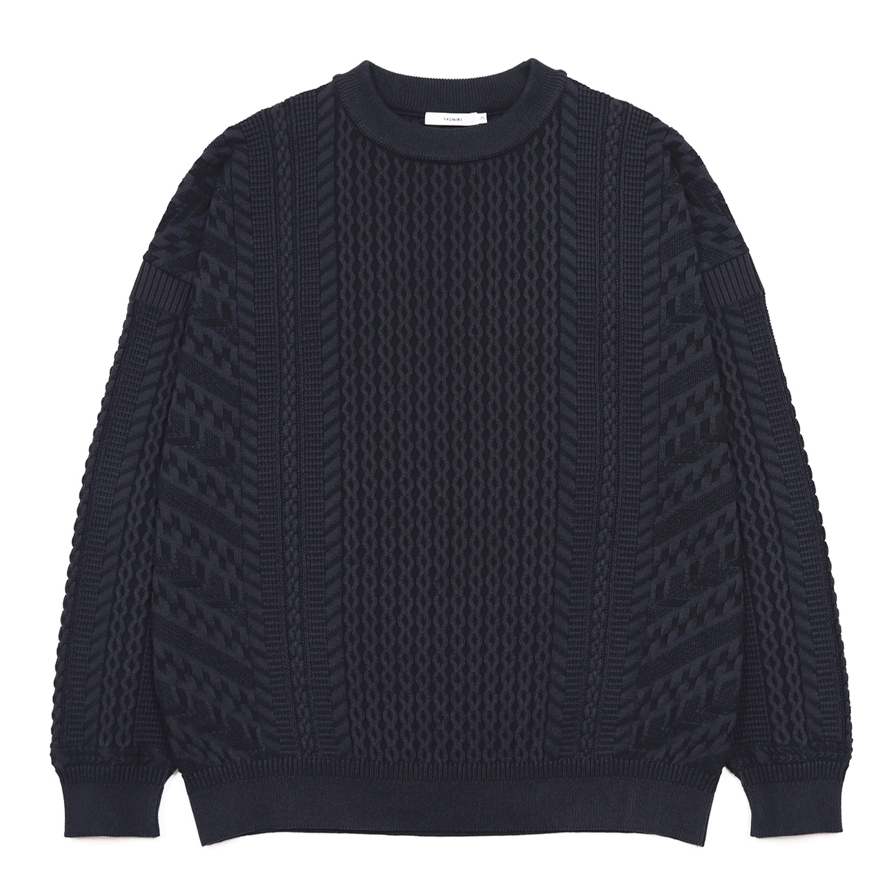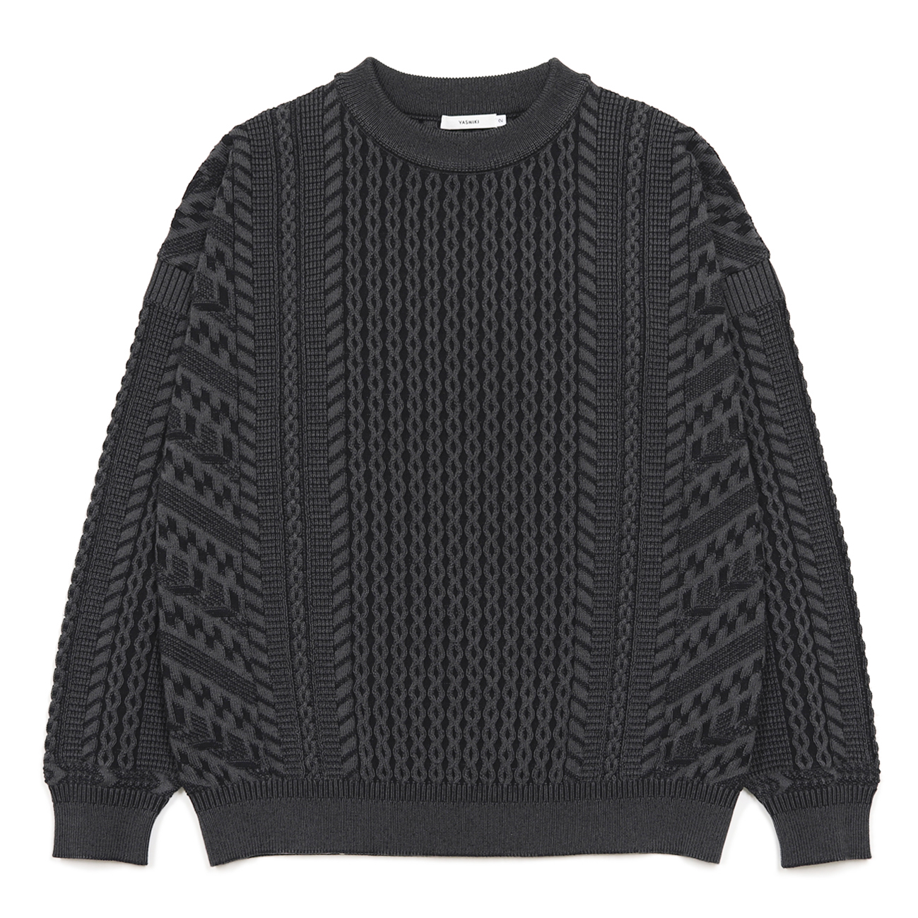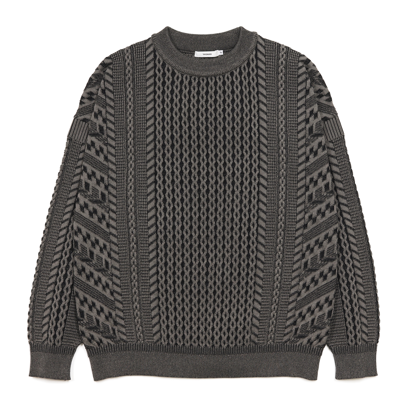 身頃中央のケーブル柄で厚い雲を表し、身頃横の斜線とケーブル柄で雪雷を表し、身頃脇の斜めに入る柄で激しく吹き付ける雪を表現しています。