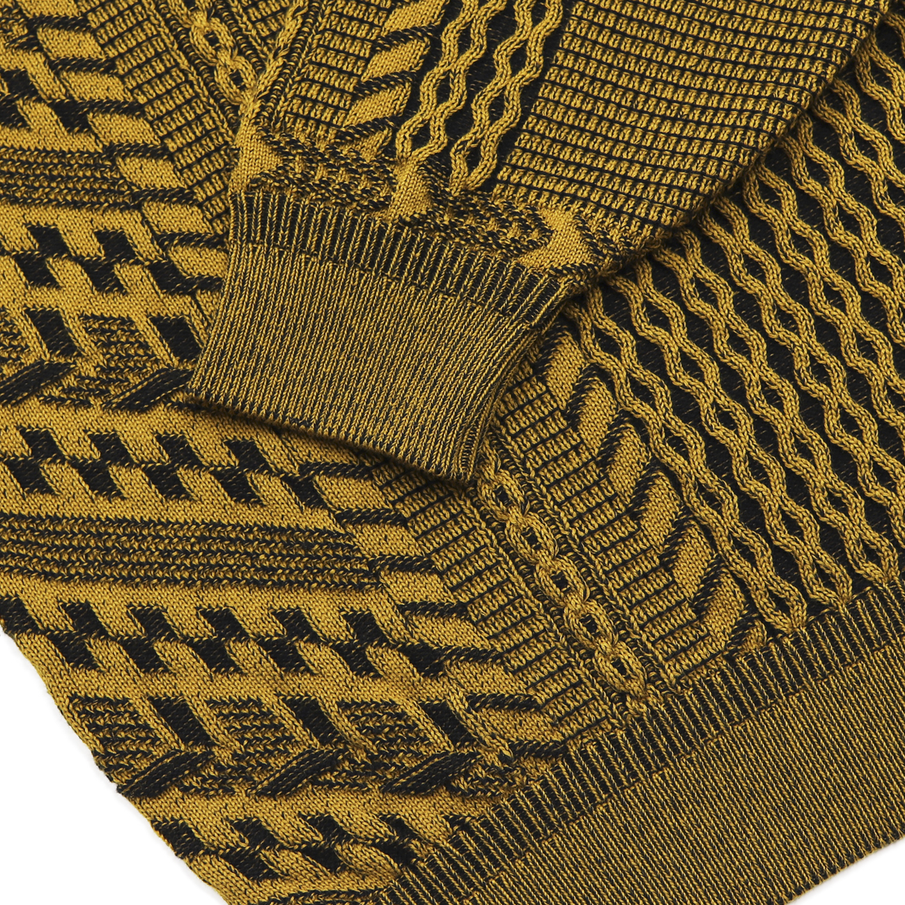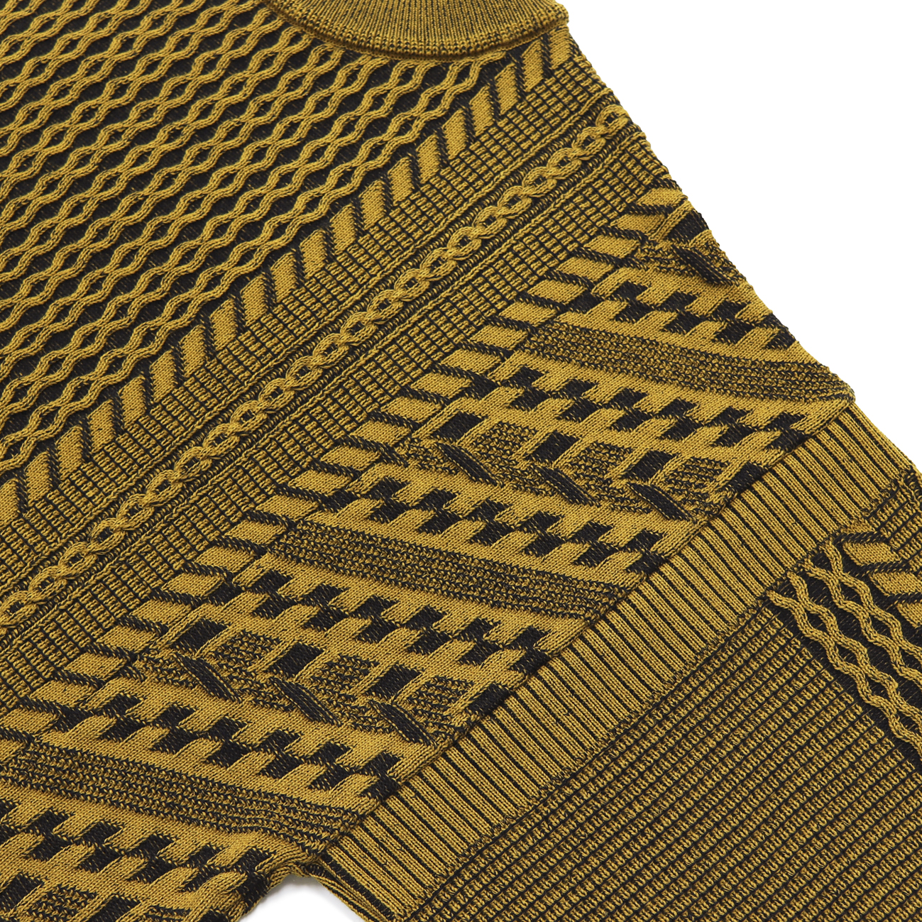 プレーティング編みと言われる表目側と裏目側で異なる糸を編む技法を使用し、表と裏で糸の色を変えて、2色で編むことで奥行きのある表情に仕上げました。