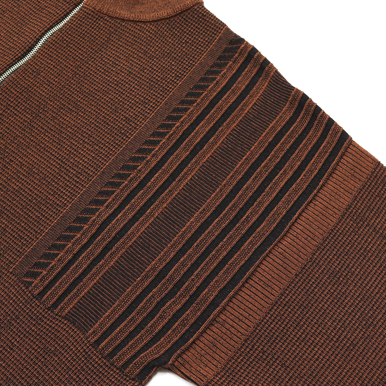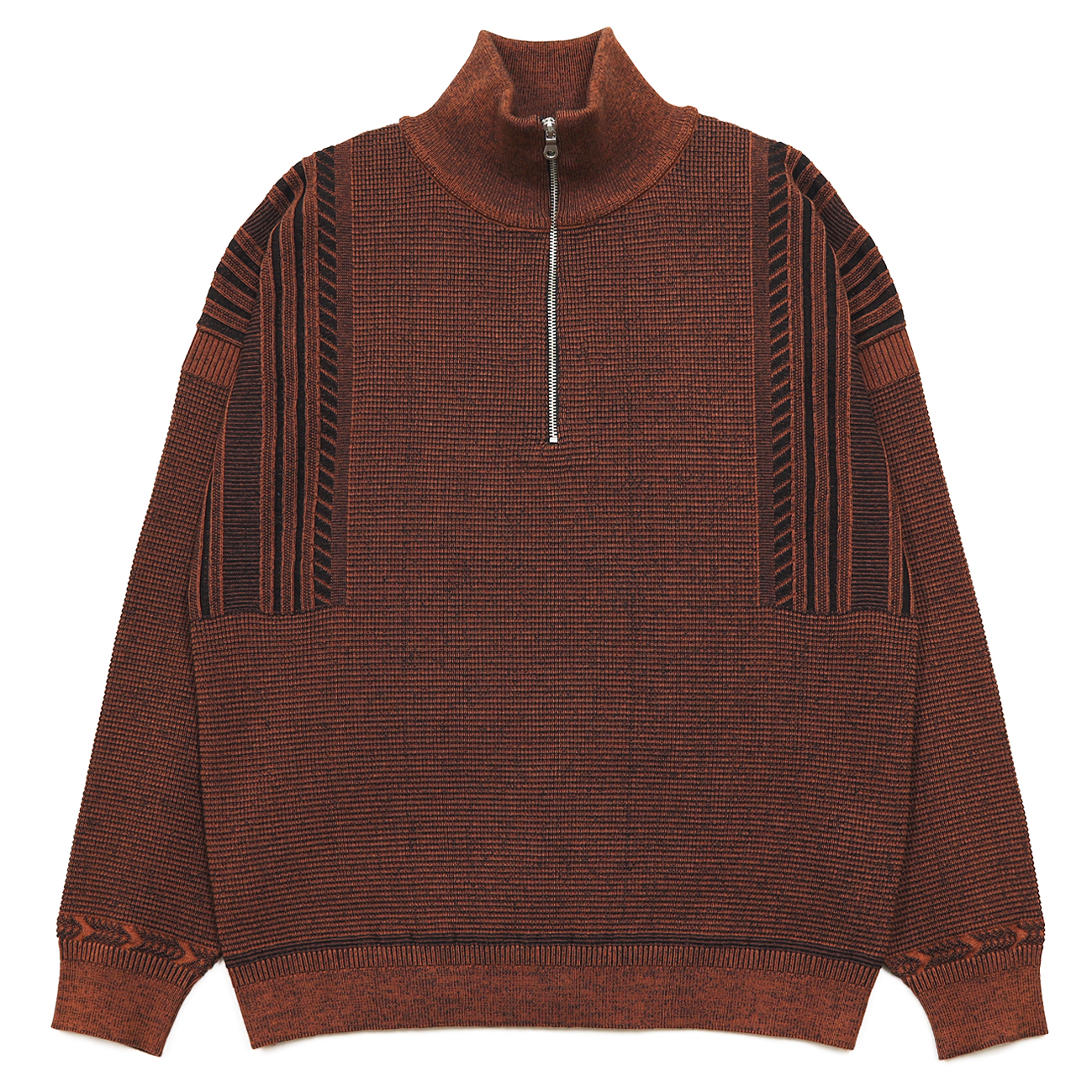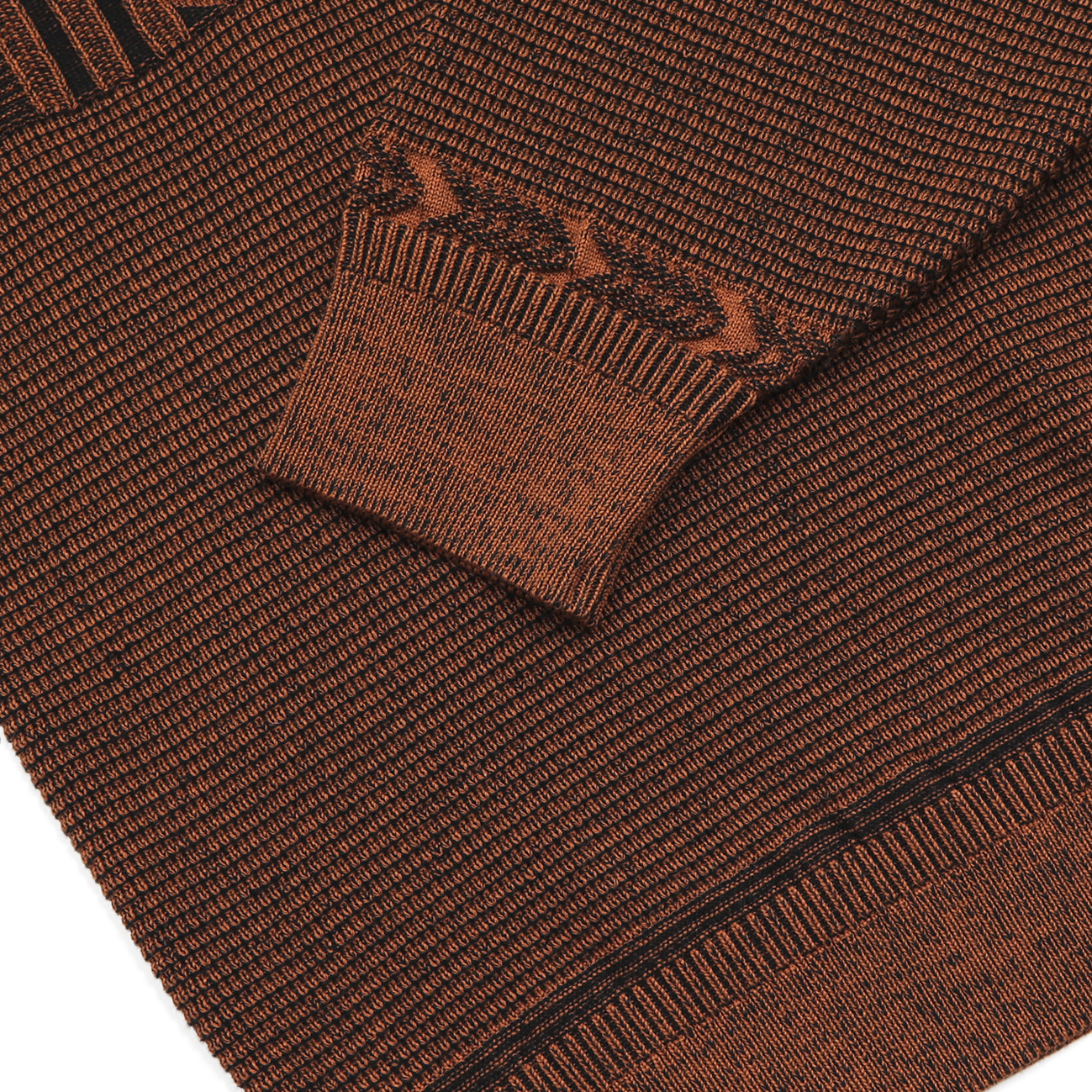 プレーティング編みと言われる表目側と裏目側で異なる糸を編む技法を使用し、表と裏で糸の色を変えて、2色で編むことで奥行きのある表情に仕上げました。