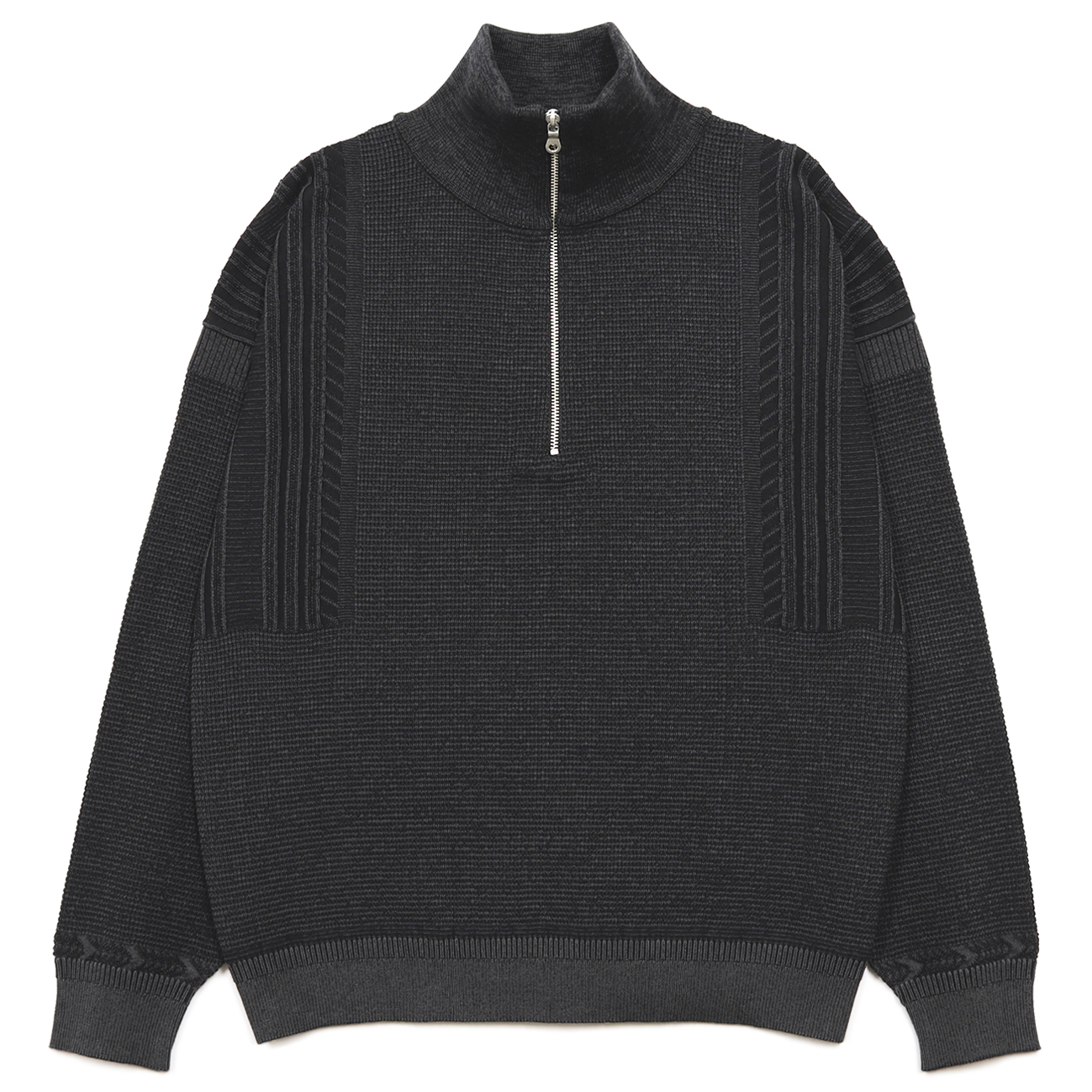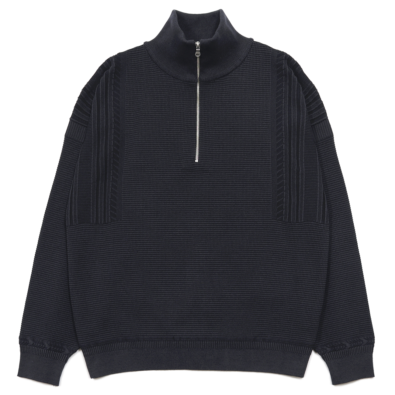 ベースの細かなワッフル柄は黒く濡れた道路を表し、肩の斜線や細かな凹凸の筋で雷と雨を表現しています。