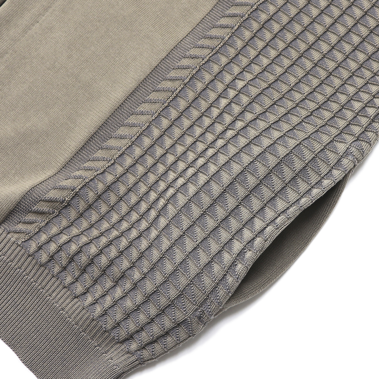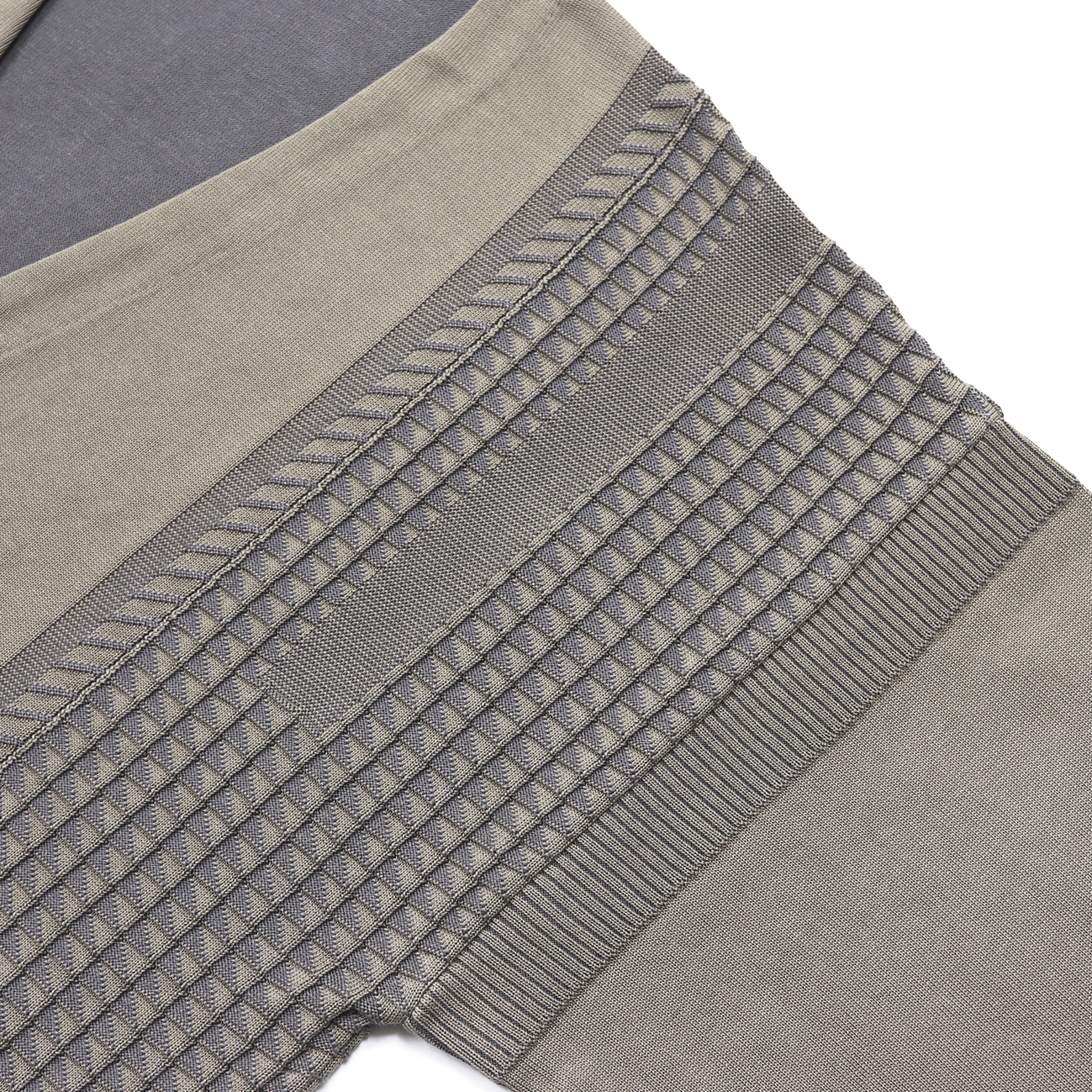ベースの目づらが揃って光沢性のある天竺編でシンプルに仕上げることでよく冷えた朝を表し、身頃脇の細かな三角形の柄で薄く張った水たまりの氷を表しました。