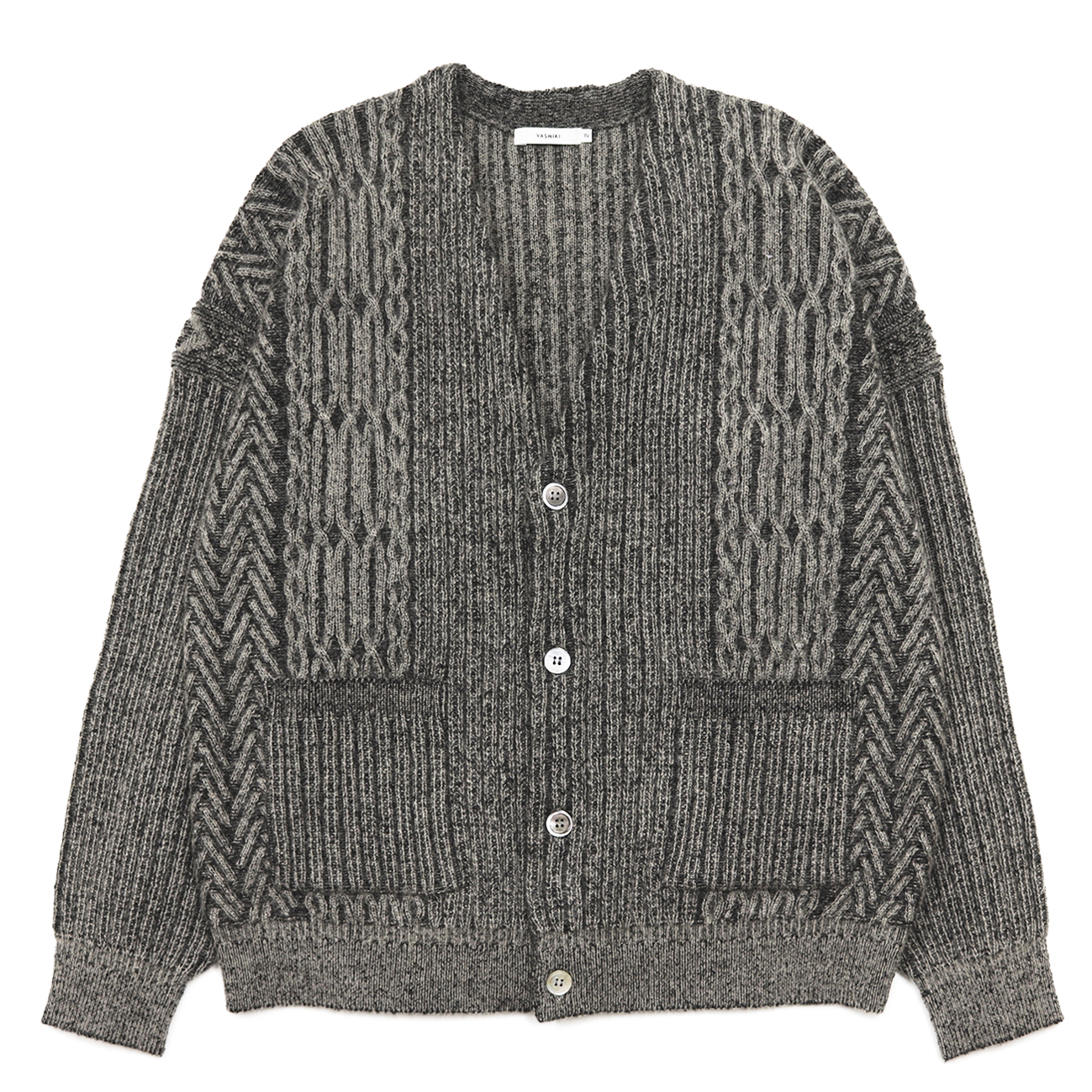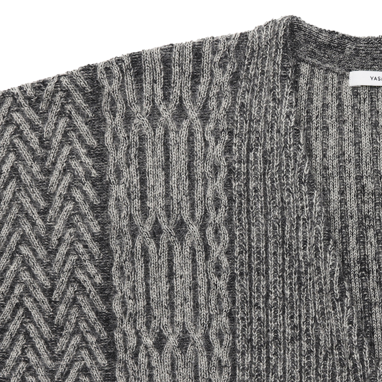 身頃中央と袖の柄で雪に覆われた畝や畦道を表し、身頃横のケーブル柄で轍を表し、身頃脇の柄で雪が積もった木々を表しています。