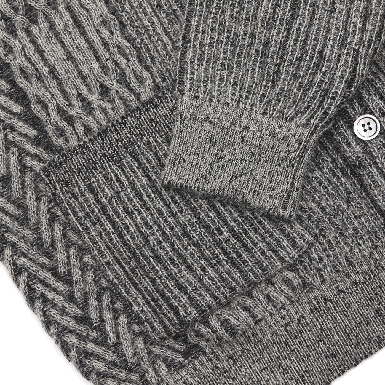 プレーティング編みと言われる表目側と裏目側で異なる糸を編む技法を使用し、表と裏で糸の色を変えて、2色で編むことで奥行きのある表情に仕上げました。