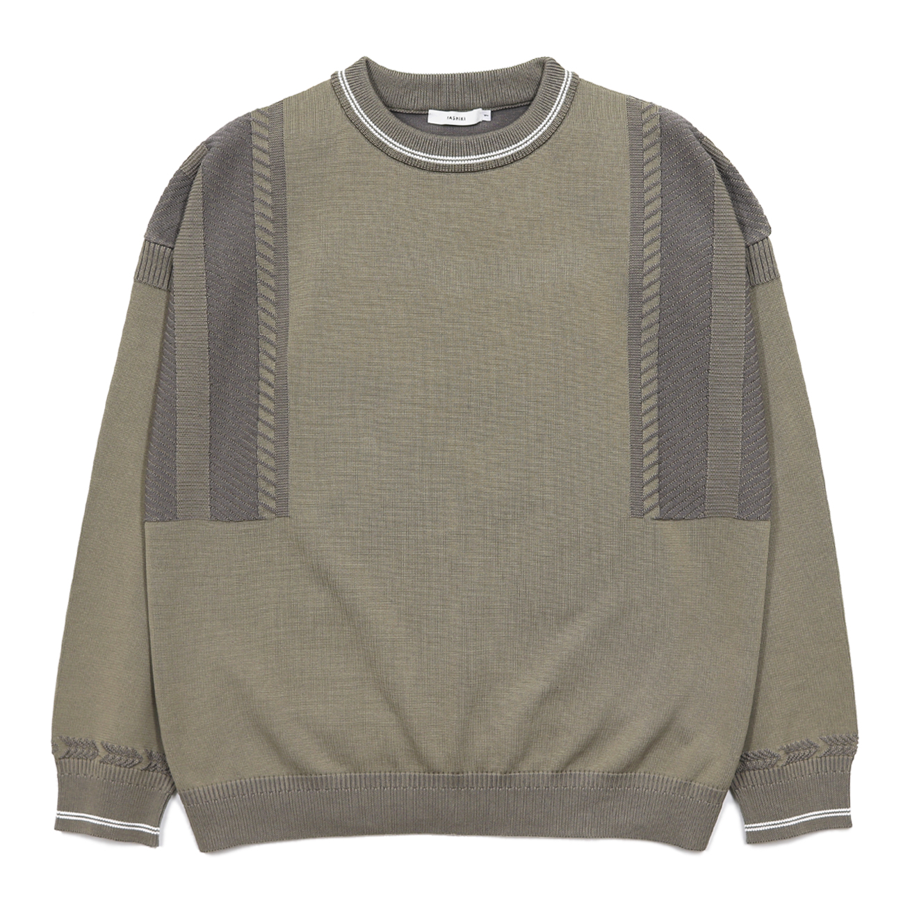 ベースのプレーンな天竺編みでと首と袖のラインで冷え込んだ朝の空気を表し、肩の細かな斜線で土を持ち上げる霜柱を表しています。