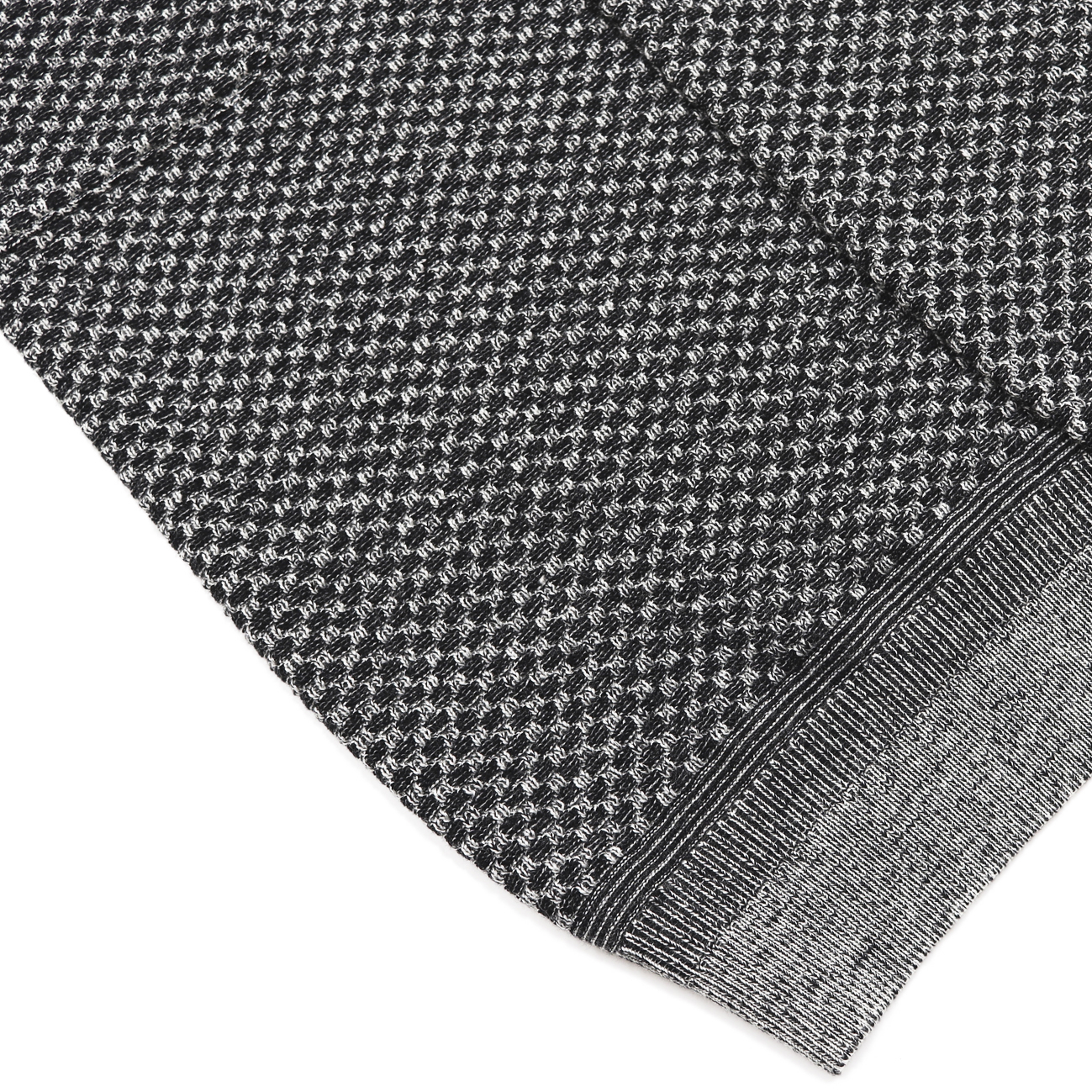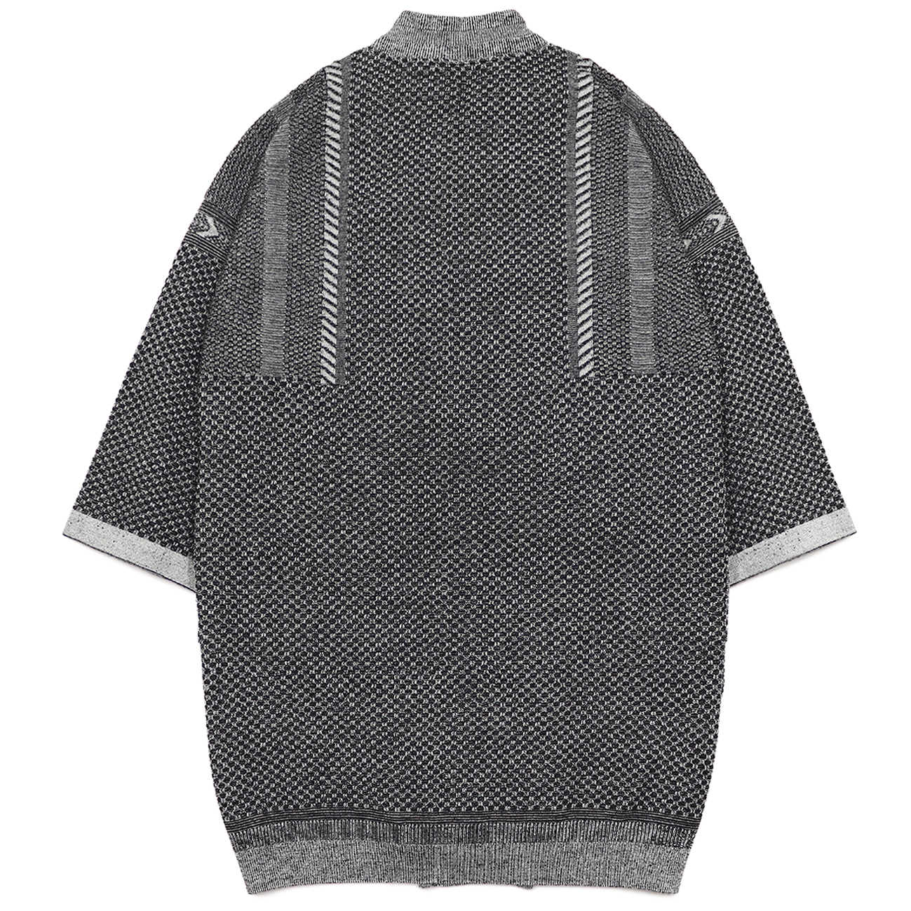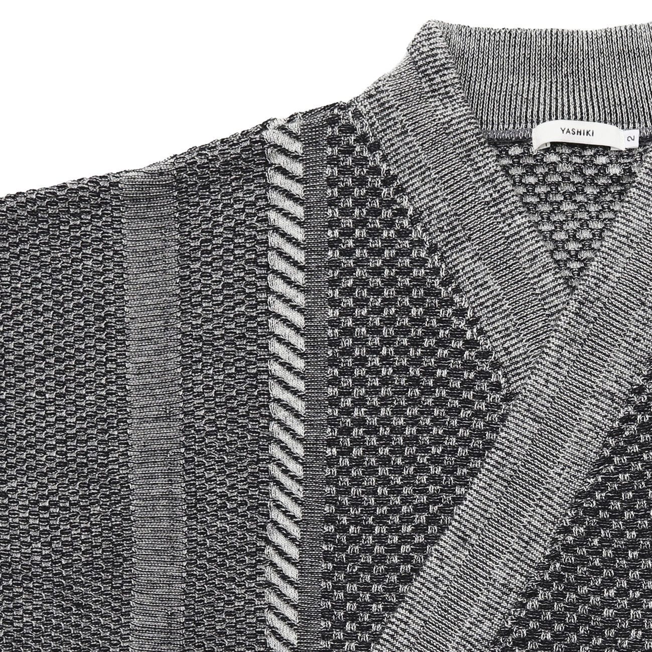 全面に入った丸みのある凹凸の編み地で降り積もったまっさらな雪を表し、肩の細かな凹凸柄で足跡を表しました。