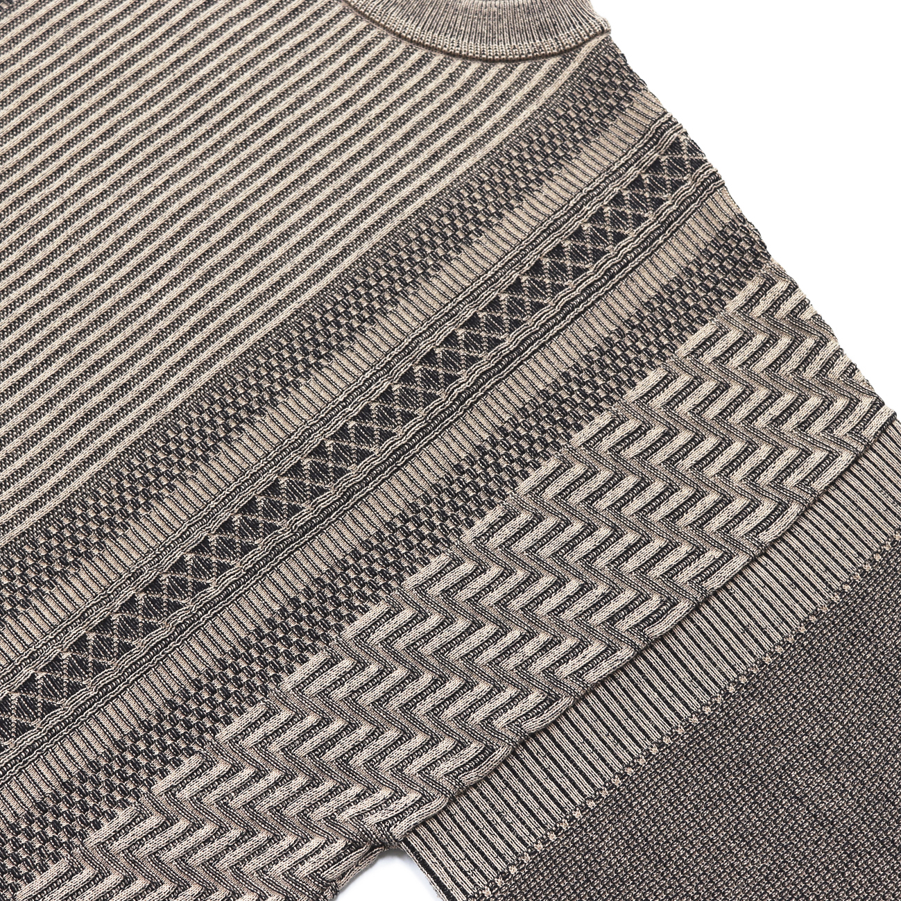 プレーティング編みと言われる表目側と裏目側で異なる糸を編む技法を使用し、表と裏で糸の色を変えて、2色で編むことで奥行きの